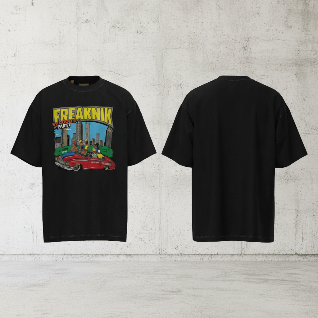Gallery Dept. Freaknik Party graphic tee, black cotton, vibrant retro car and city print, casual oversized streetwear style, perfect for hip-hop and urban fashion lovers.