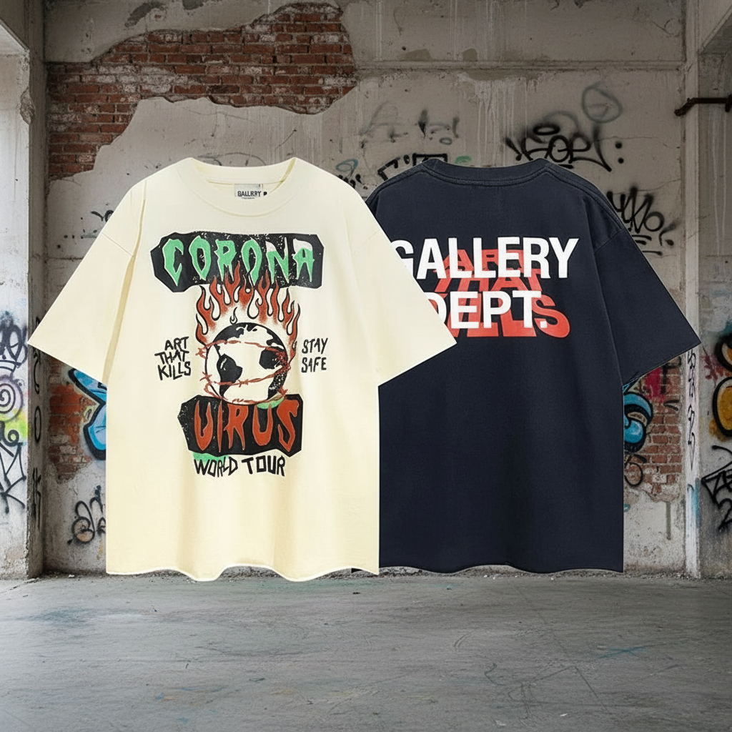 Gallery Dept graphic T-shirt, casual streetwear style with bold front and back prints, soft cotton fabric, perfect for everyday fashion and urban outfits.