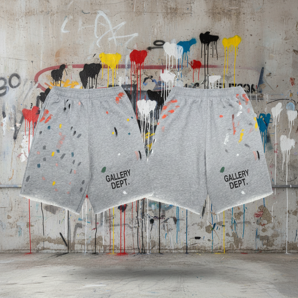 Gallery Dept. Grey Paint-Splatter Shorts, casual streetwear design with elastic waistband, soft cotton fabric, and unique artistic print for a stylish urban look.