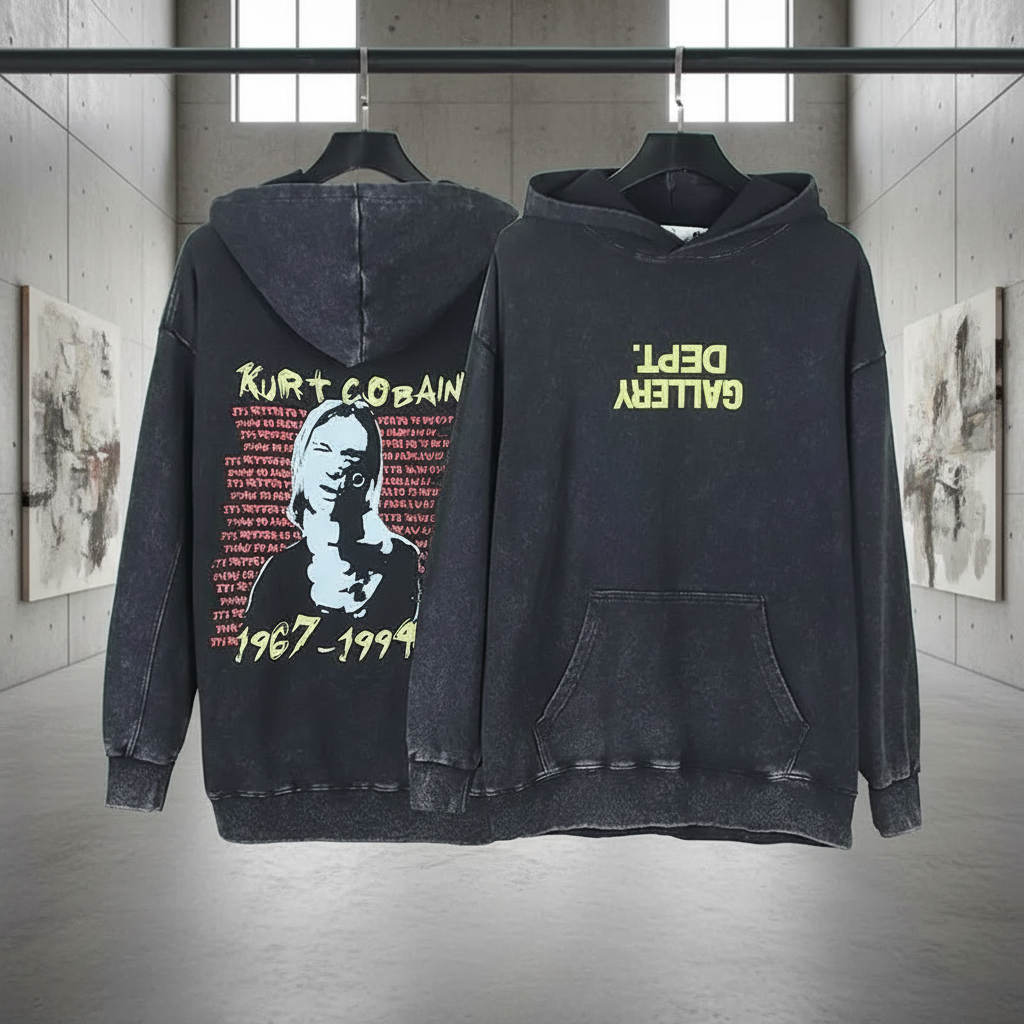 Gallery Dept. vintage black hoodie with Kurt Cobain graphic print, retro streetwear style, soft cotton blend, perfect for casual wear and music lovers.