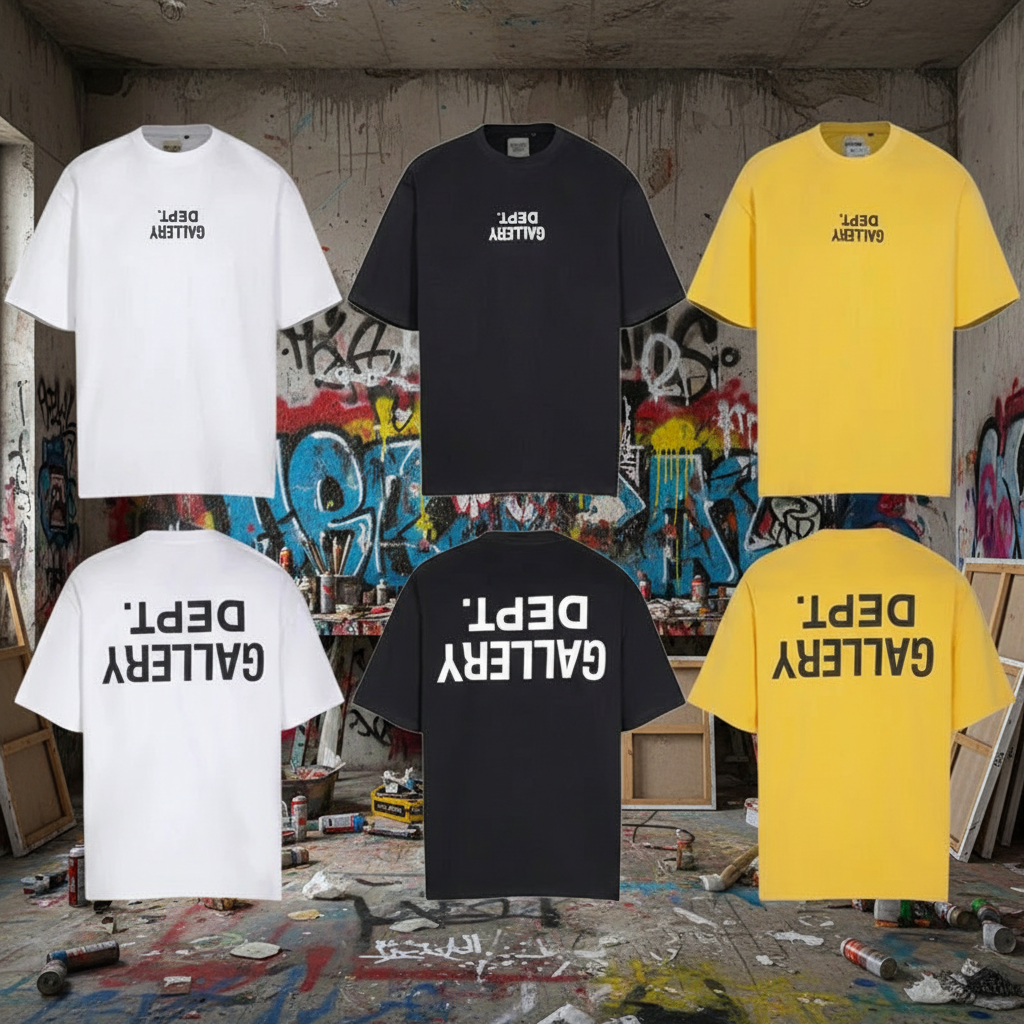 Gallery Dept T-Shirts, casual unisex style, short sleeve cotton tops with bold logo print, perfect for streetwear fashion in white, black, and yellow colors.