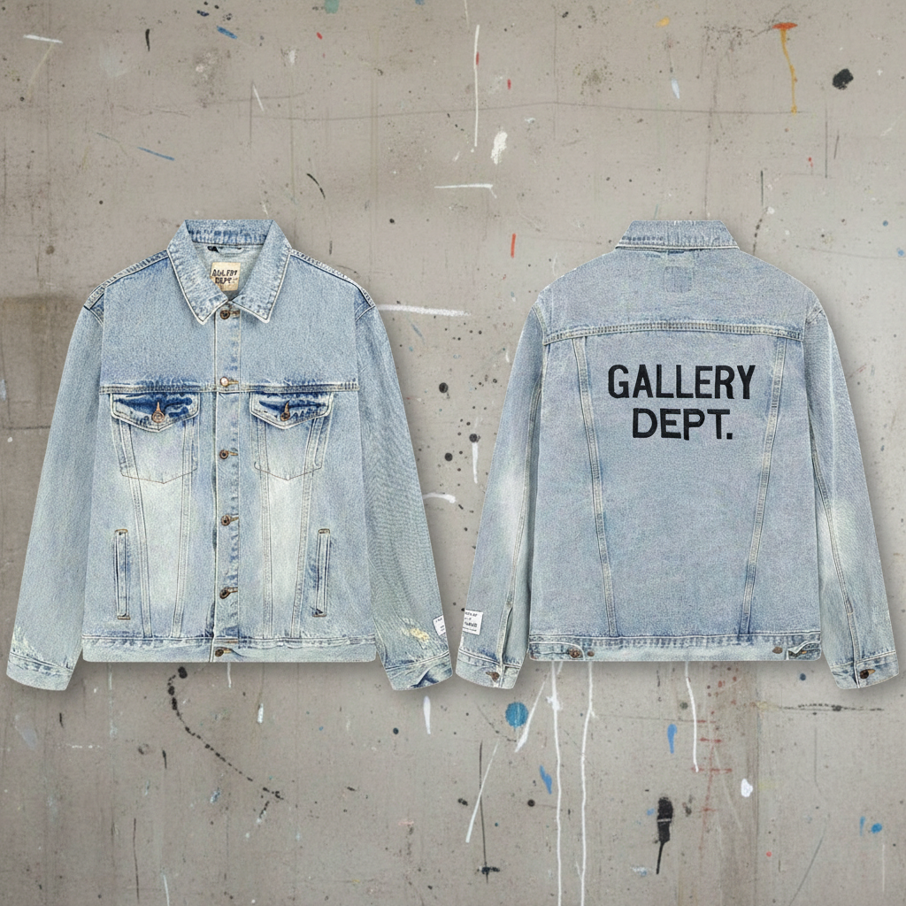 Gallery Dept denim jacket, vintage washed blue, Los Angeles style, casual streetwear fashion with logo print, classic button front and pockets for men and women.