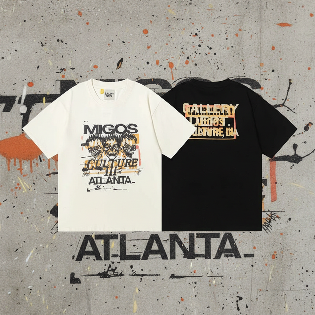 Gallery Dept Migos Culture III Atlanta graphic T-shirt, stylish streetwear in black and white, premium cotton, perfect for hip hop fashion lovers.