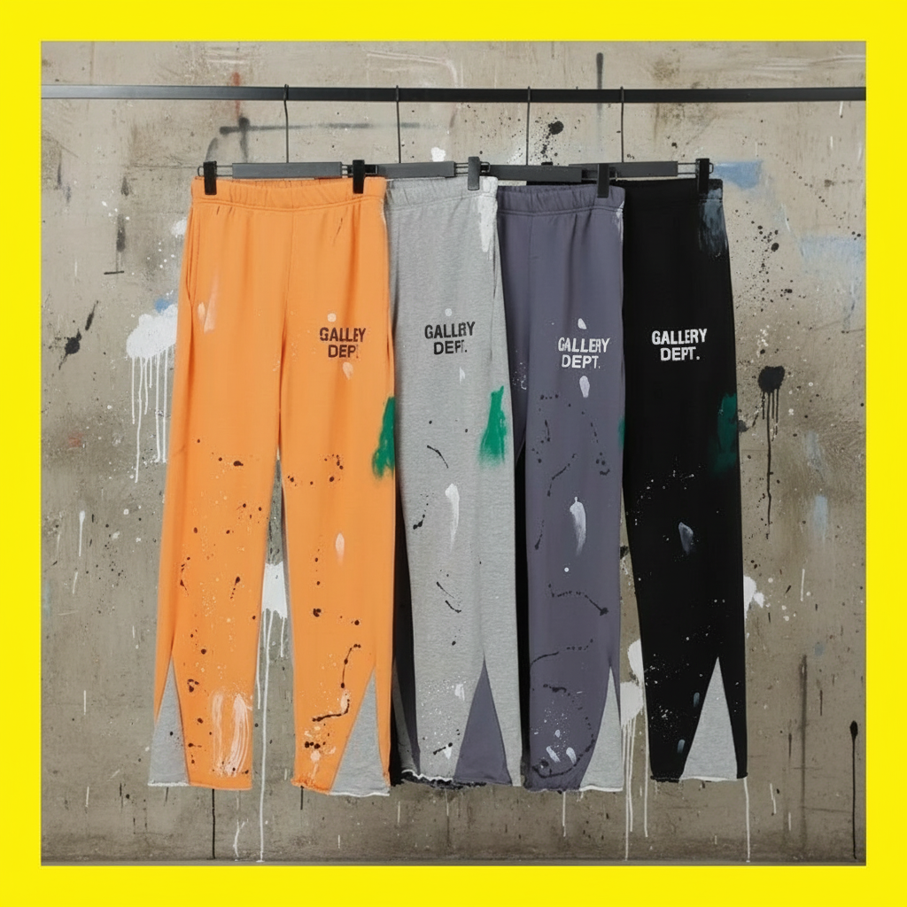 Gallery Dept. Paint-Splatter Jogger Pants, stylish streetwear with unique artistic design, available in orange, grey, purple, and black for casual and trendy looks.