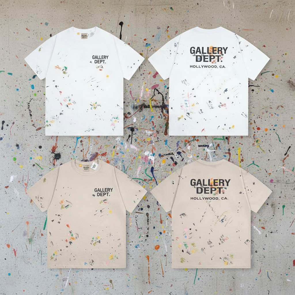 Gallery Dept Paint Splatter T-Shirt, casual unisex style with artistic design, premium cotton, perfect for streetwear fashion lovers seeking unique Hollywood-inspired looks.
