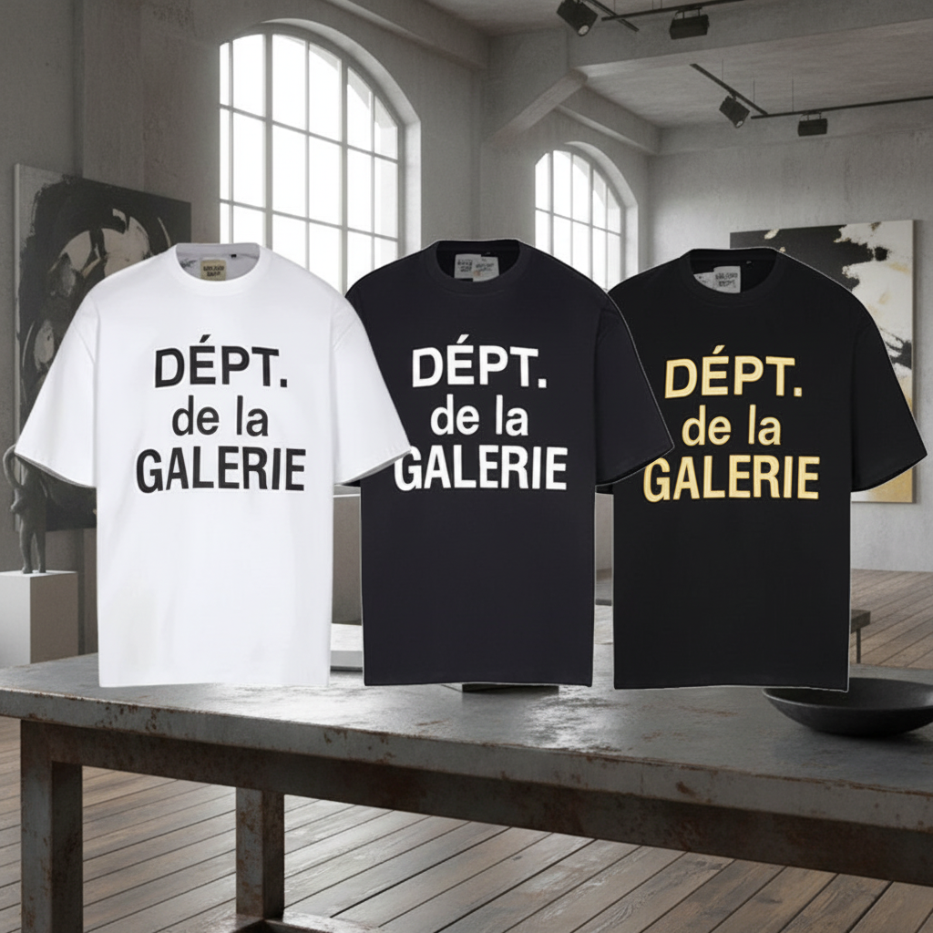 Gallery Dept. T-Shirts featuring bold “DEPT. de la GALERIE” print, premium cotton, unisex design, perfect for streetwear style and casual everyday outfits.
