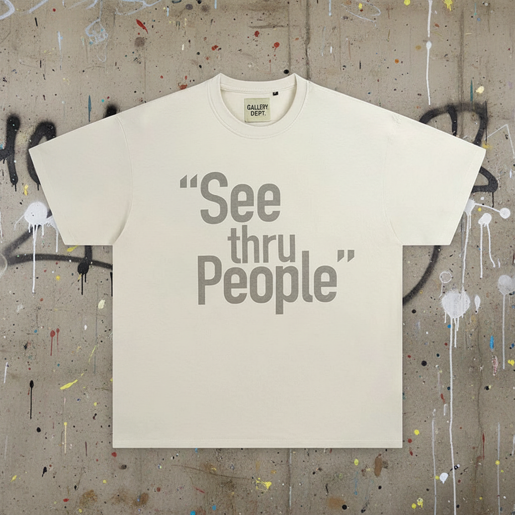 Gallery Dept classic white cotton T-shirt with bold “See Thru People” graphic, casual streetwear style, breathable and comfortable for daily wear.