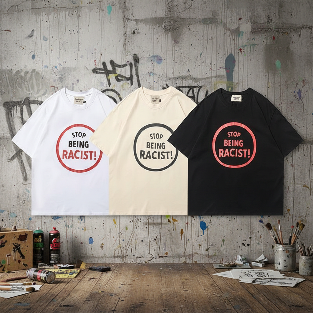 Gallery Dept T-Shirt Unisex Casual Tee with “Stop Being Racist” Print, Streetwear Style, Soft Cotton, Available in Black, White, Beige for Everyday Fashion.