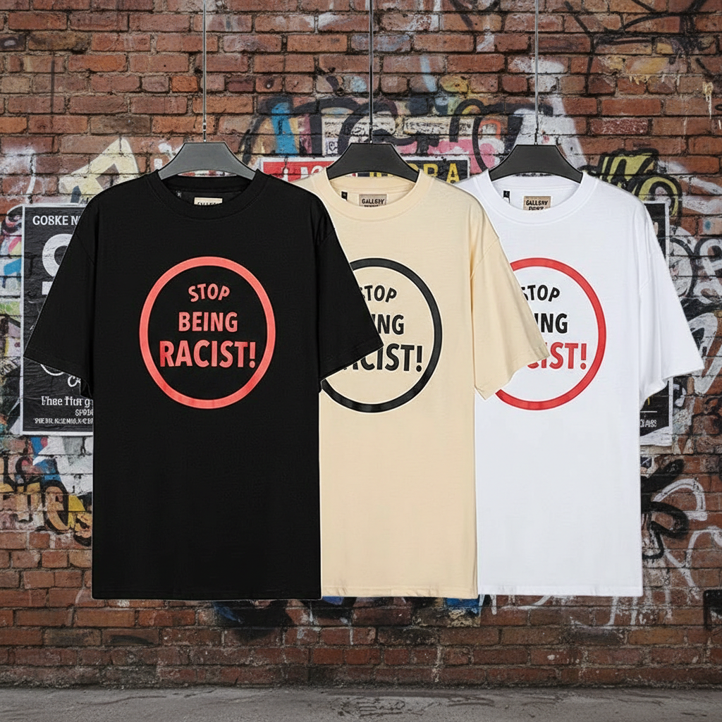 Gallery Dept T-Shirt unisex casual top with “Stop Being Racist” print, available in black, beige, and white, perfect streetwear for daily style and statement fashion.