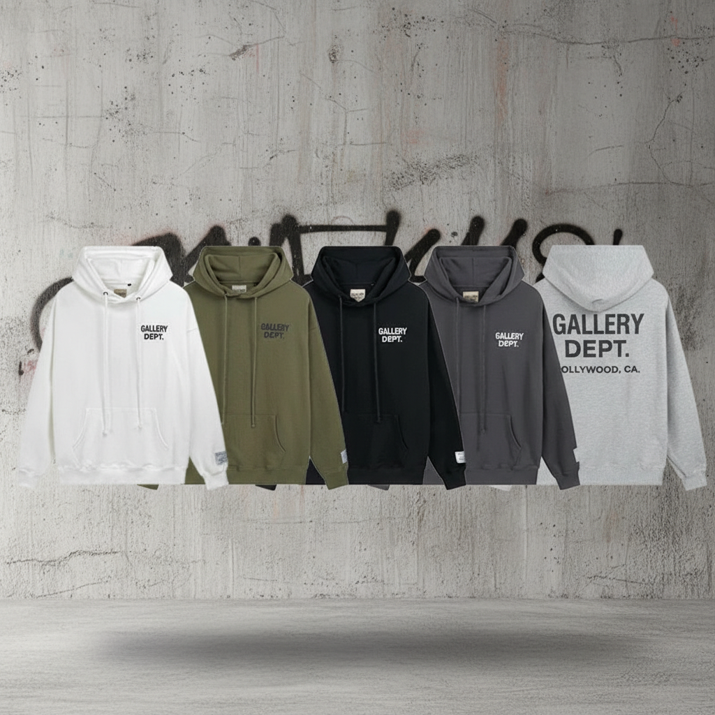 Gallery Dept hoodies in multiple colors, casual streetwear style, soft cotton fabric, perfect for layering, unisex fit for everyday comfort and fashion.