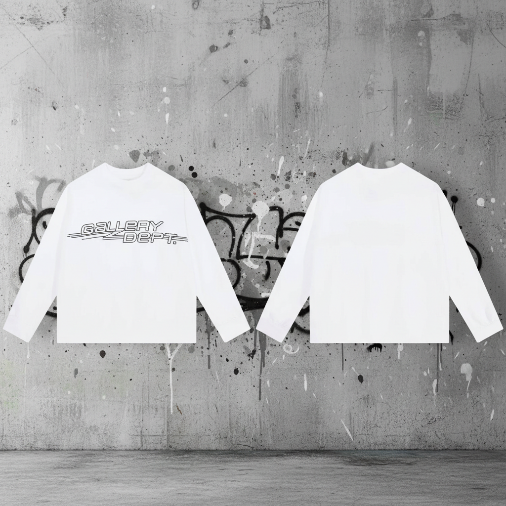Gallery Dept. White Long Sleeve T-Shirt featuring bold logo print, premium cotton fabric, and relaxed fit for casual streetwear style.