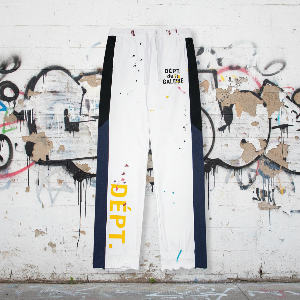 Gallery Dept White Paint-Splatter Pants, artistic streetwear style with bold logo print, elastic waist and color-block design for a unique urban fashion look.