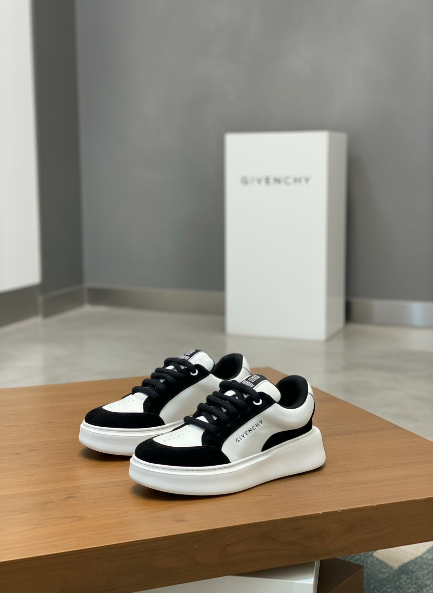 Givenchy black and white leather sneakers, luxe design with thick sole, premium comfort and style, perfect for casual or streetwear fashion.