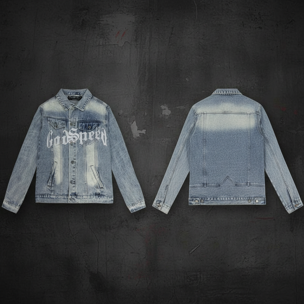 Godspeed vintage washed denim jacket with bold front logo, classic collar, button closure, and stylish streetwear design for casual and trendy outfits.