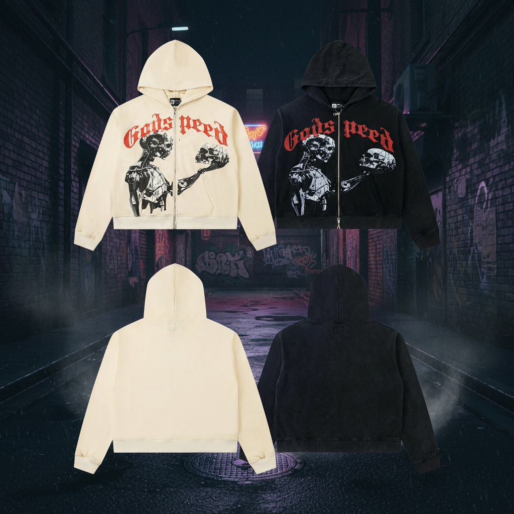 Godspeed Hoodie – Stylish unisex zip-up hooded sweatshirt with bold skeleton graphic, available in black and beige. Perfect streetwear for casual, trendy looks and cool comfort daily.