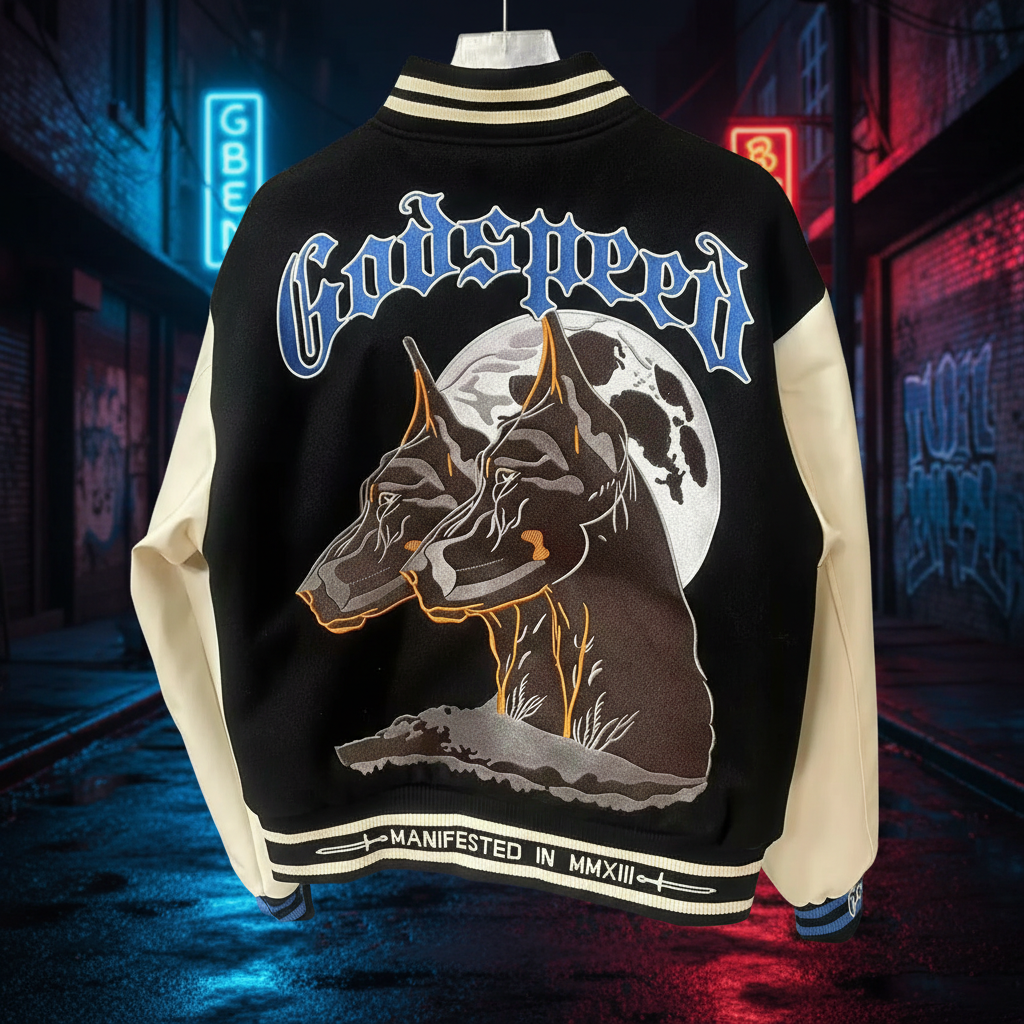 Godspeed Varsity Jacket with twin Doberman embroidery and moon graphic, black and cream design, streetwear style for men and women.