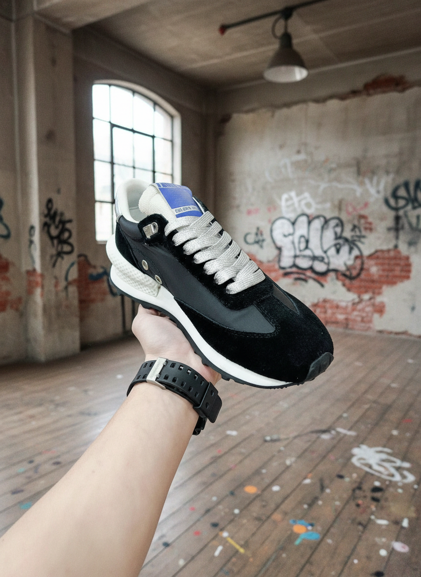 Golden Goose black suede and mesh sneakers with white laces, cushioned sole, and sporty design for casual and streetwear style. Perfect comfort and fashion in one.