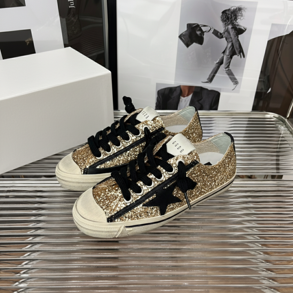 Golden Goose glitter sneakers with black star detailing, low-top design, and vintage-style sole for a trendy, casual yet luxurious look.