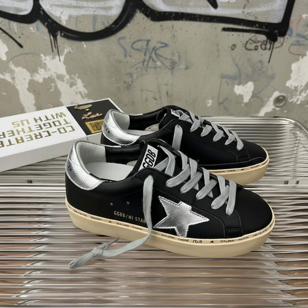 Golden Goose Hi Star sneakers in black with silver star and heel detail, premium leather, vintage-inspired sole, stylish comfort for everyday wear.