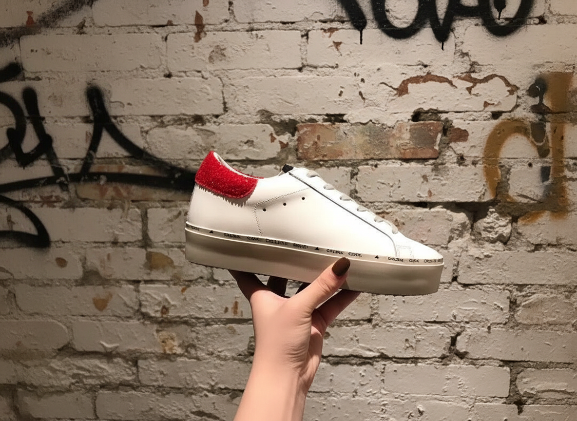 Golden Goose Hi Star sneakers with glitter star, white leather upper, red heel detail, and platform sole for stylish comfort and casual luxury.