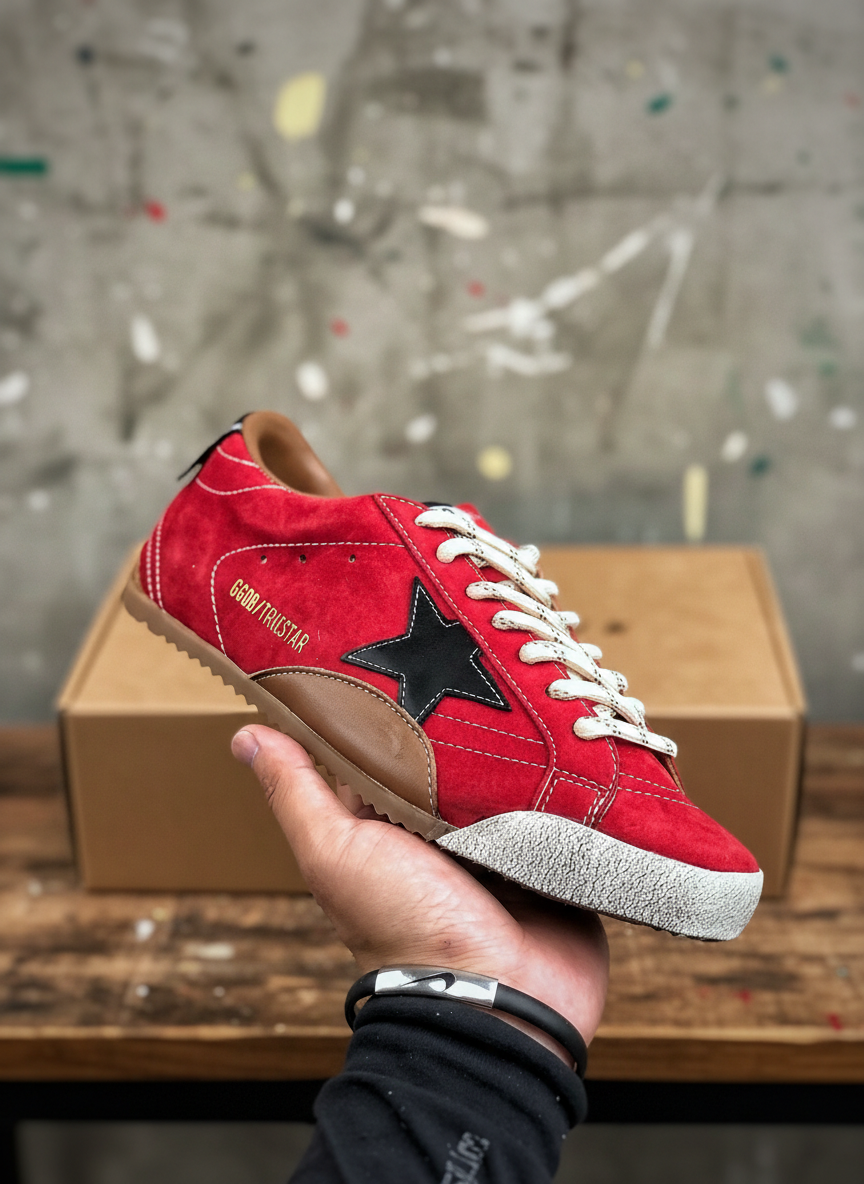 Golden Goose red suede sneakers with black star detail, durable sole, and vintage-inspired design for stylish everyday wear.