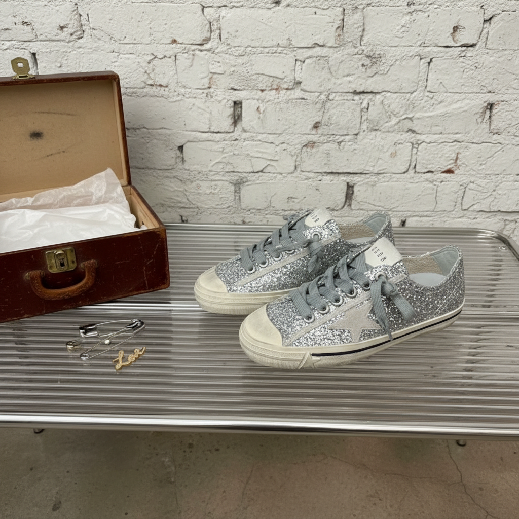 Golden Goose women’s glitter low-top sneakers with iconic star detail, grey laces, and vintage distressed sole for casual luxury style.