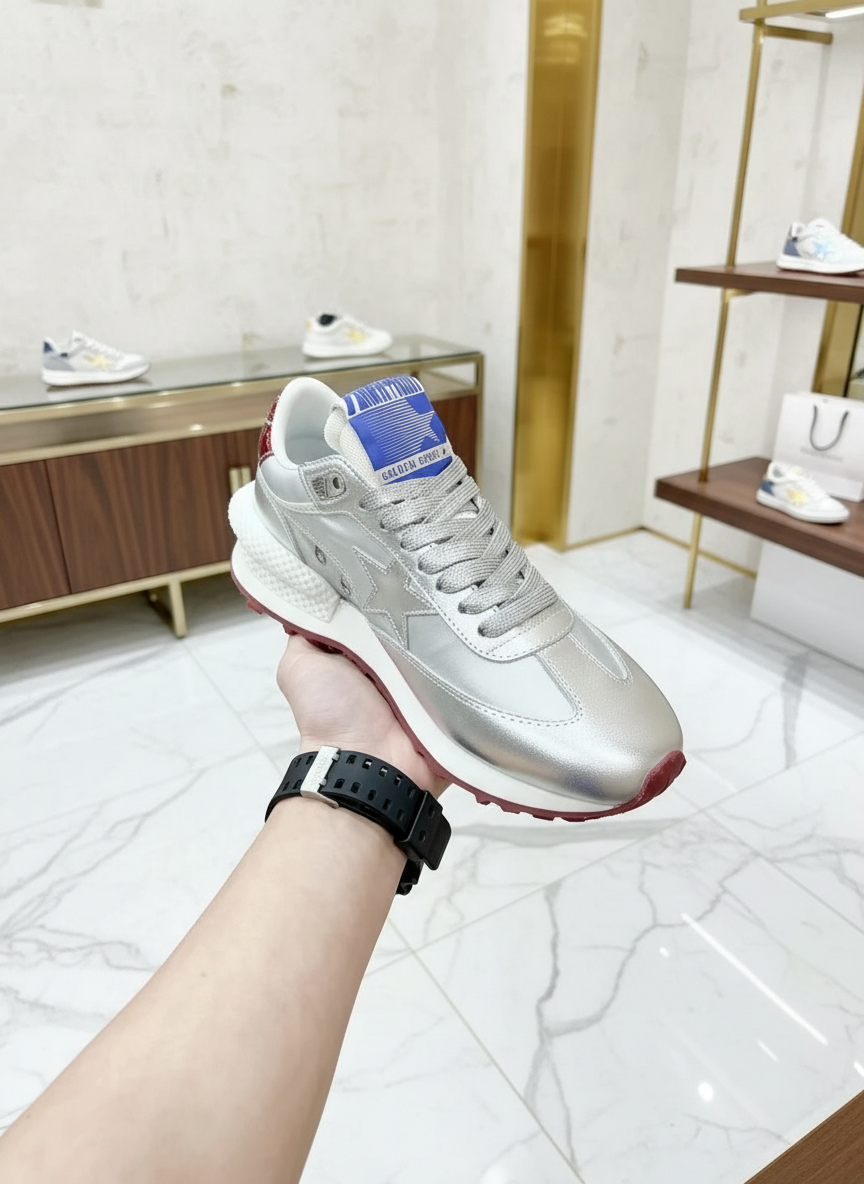 Golden Goose silver running sneakers with metallic finish, red sole, and blue label, combining luxury Italian craftsmanship with sporty comfort for everyday wear.