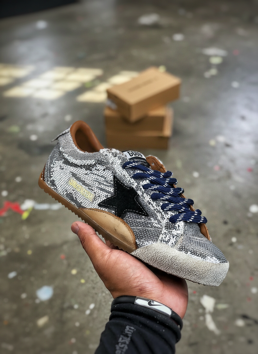 Golden Goose sequin sneakers with signature star, vintage finish, and premium craftsmanship for stylish everyday wear.