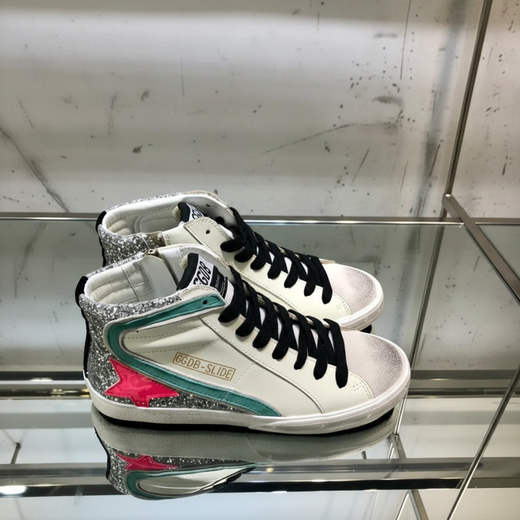 Golden Goose GGDB Slide sneakers feature white leather, glitter details, teal and pink star accents, and black laces for a stylish casual look.