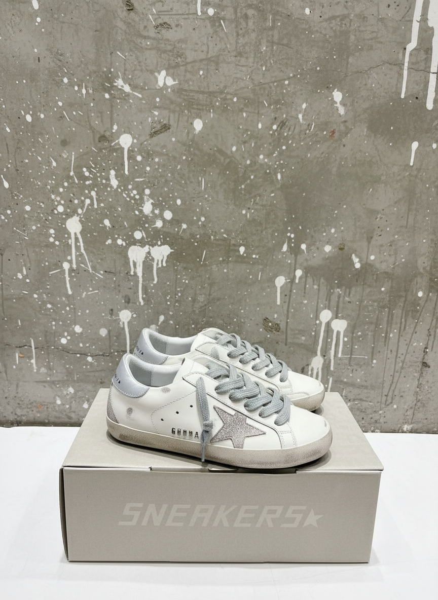 Golden Goose white leather sneakers with signature star design, grey laces, and distressed sole for a stylish vintage look, perfect for casual and trendy outfits.