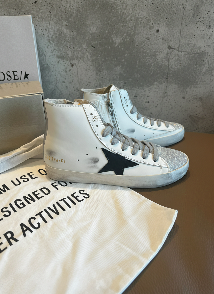 Golden Goose high-top sneakers with signature star, white leather, glitter toe, side zip, and distressed sole for a stylish vintage look.