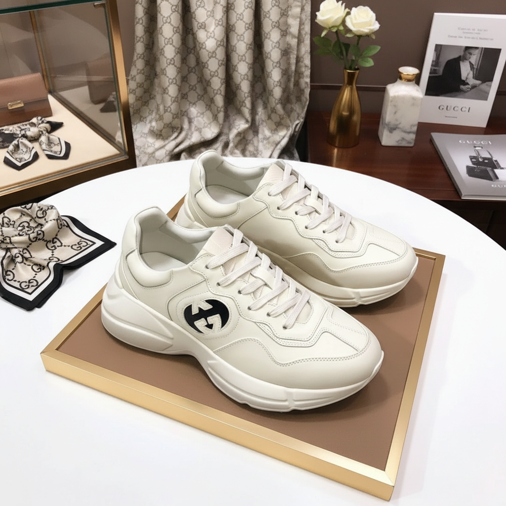 Gucci Men’s Luxury Leather Sneakers, Stylish White Chunky Trainers with Iconic Logo, Comfortable Casual Fashion Shoes for Everyday Wear