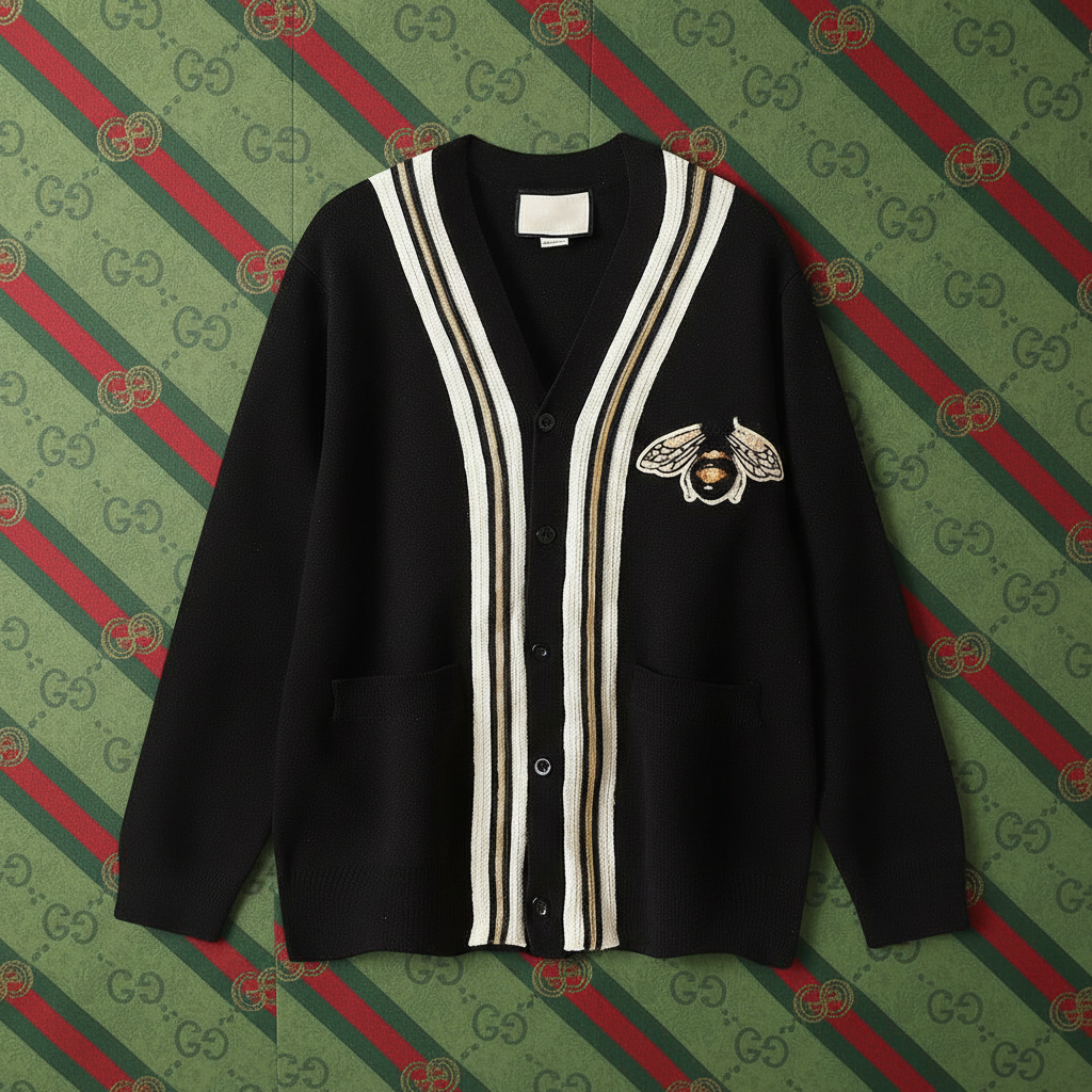 Gucci Black Cardigan with Striped Trim and Bee Embroidery, Stylish V-Neck Knitwear for Men and Women, Fashionable Casual Outerwear