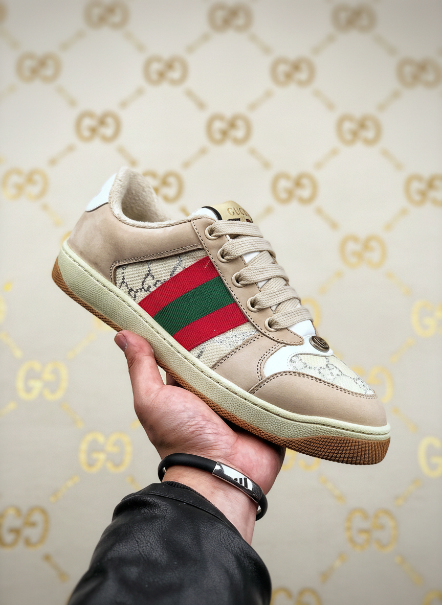 Gucci Men’s Beige Sneakers with Signature Web Stripe, Premium Leather and Canvas, Stylish Comfort for Casual or Streetwear Fashion.