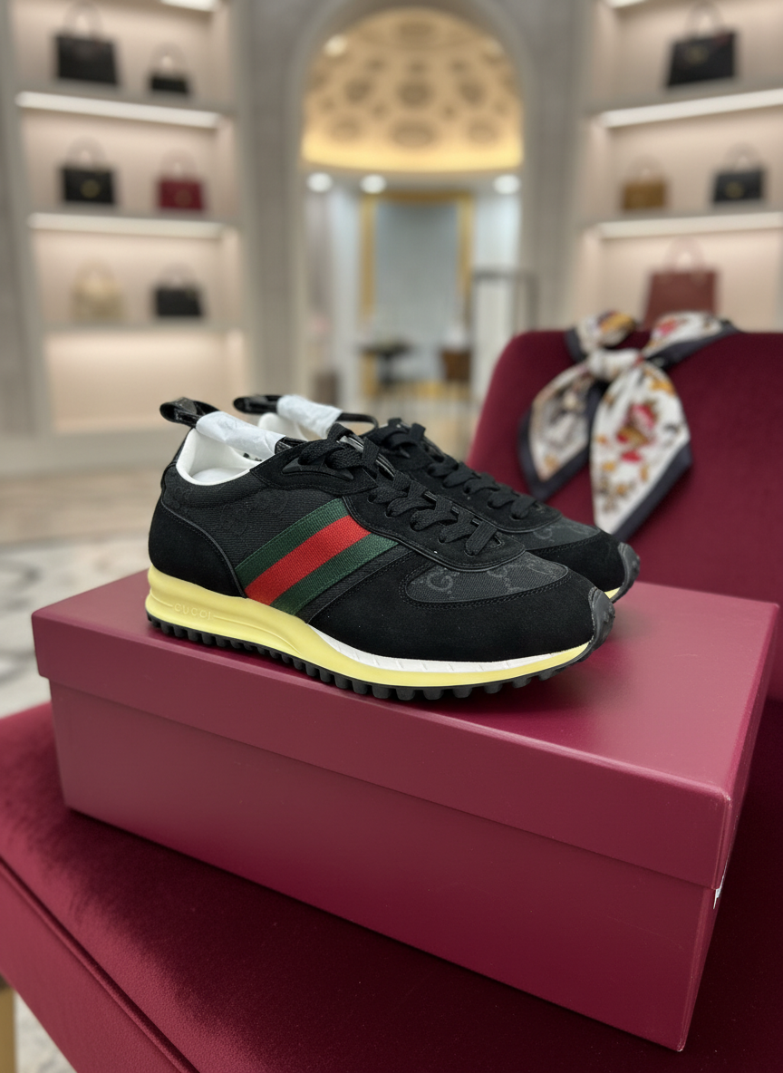 Gucci men’s black sneakers with signature green-red stripe, suede and canvas upper, yellow sole, stylish comfort for casual and sports wear.