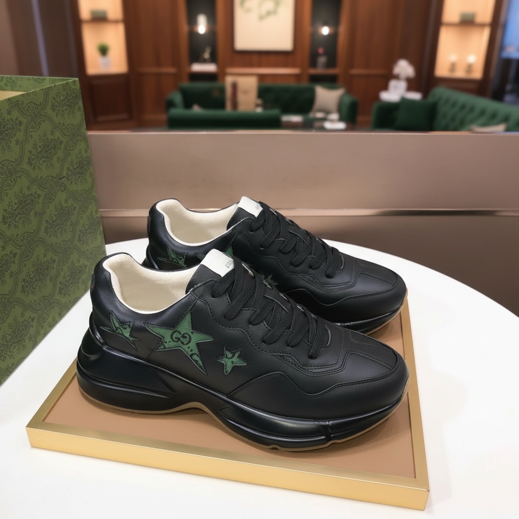 Gucci Black Leather Sneakers with Green Star Pattern, Stylish Luxury Casual Shoes for Men, Comfortable Designer Footwear for Everyday Wear