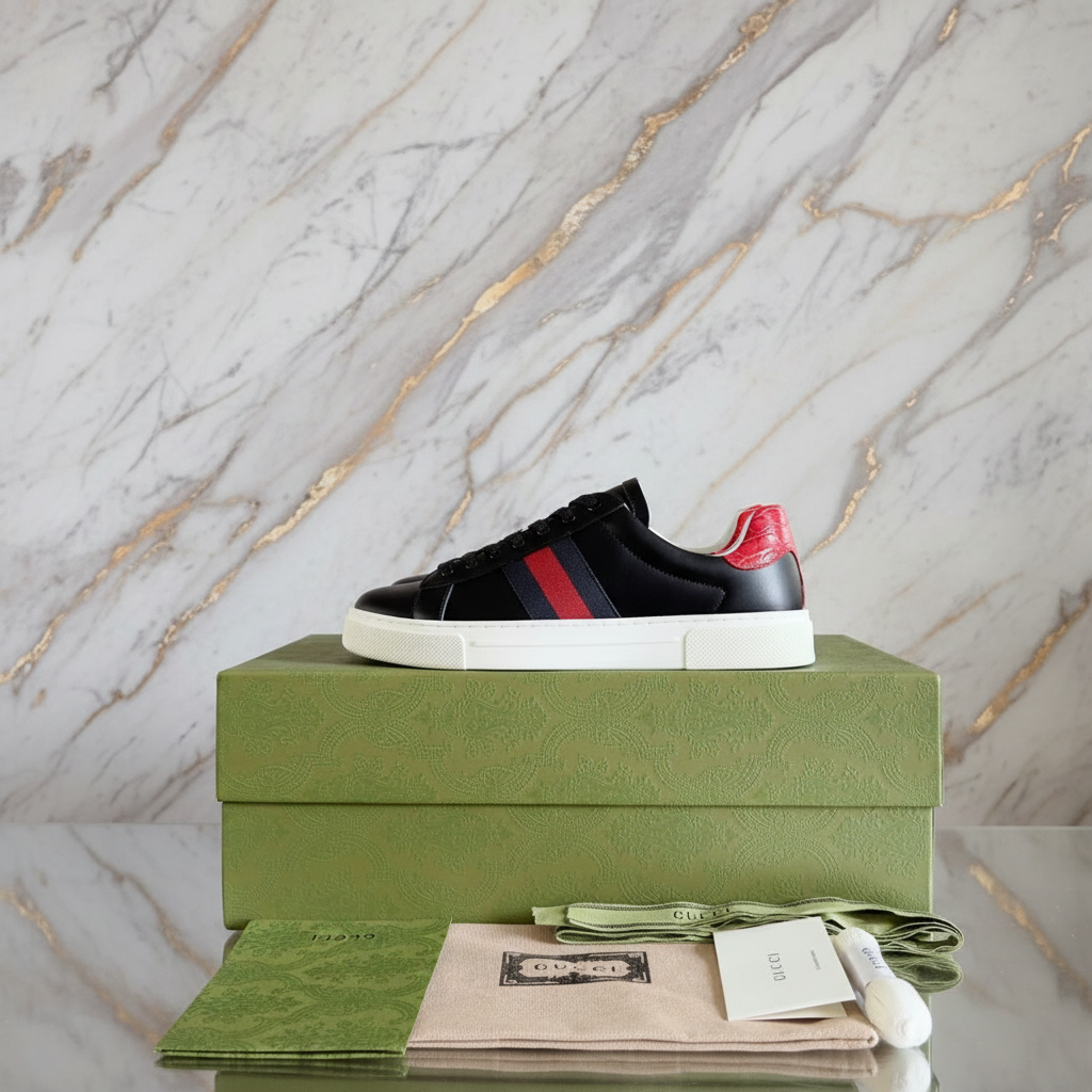 Gucci black leather sneakers with signature red and green web stripe, contrasting red heel detail, and classic low-top design for timeless luxury style.