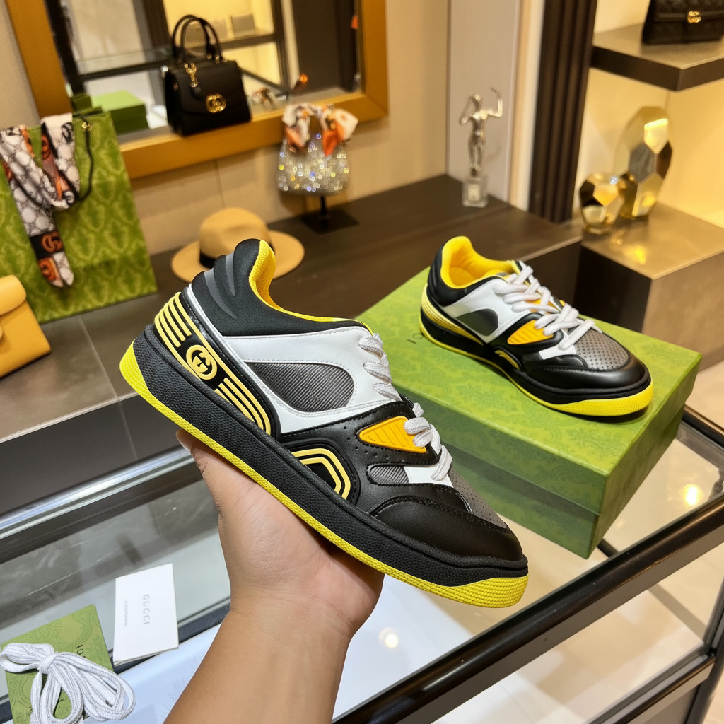 Gucci Men’s Sneakers, stylish black, white, and yellow design, breathable mesh, premium leather, comfortable fit, perfect for casual wear and street fashion.