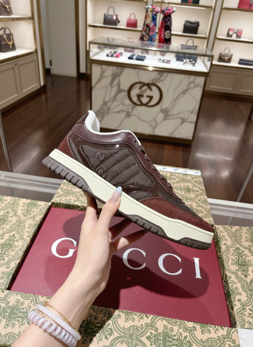Gucci men’s brown suede leather sneakers, stylish low-top design with signature GG detail, durable rubber sole, perfect for casual and streetwear fashion.