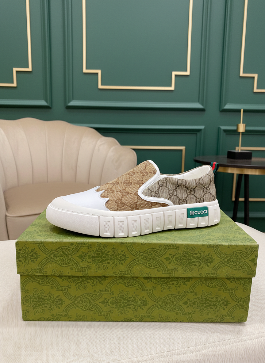 Gucci Slip-On Sneakers with iconic GG canvas, white rubber sole, and classic web detail, offering luxury style and comfort for everyday wear.