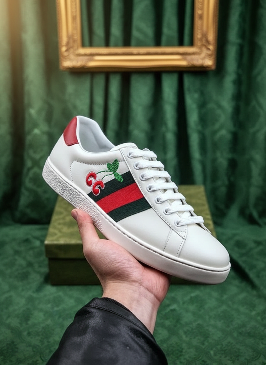 Gucci Cherry Embroidered White Leather Sneakers with Signature Green Red Web Stripe, Stylish Casual Shoes for Men and Women, Luxury Designer Footwear