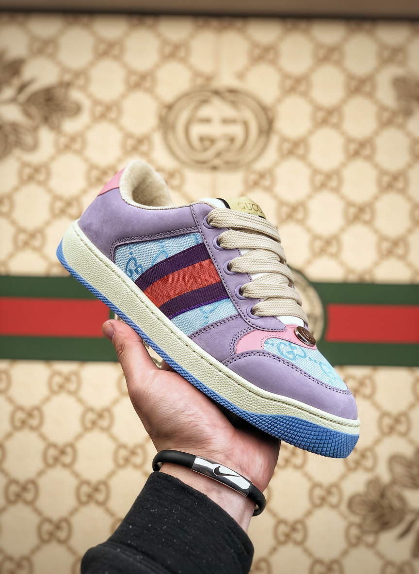 Gucci sneakers with vibrant purple, blue, and red design, premium materials, and classic stripe, offering stylish comfort for everyday wear and fashion-forward looks.
