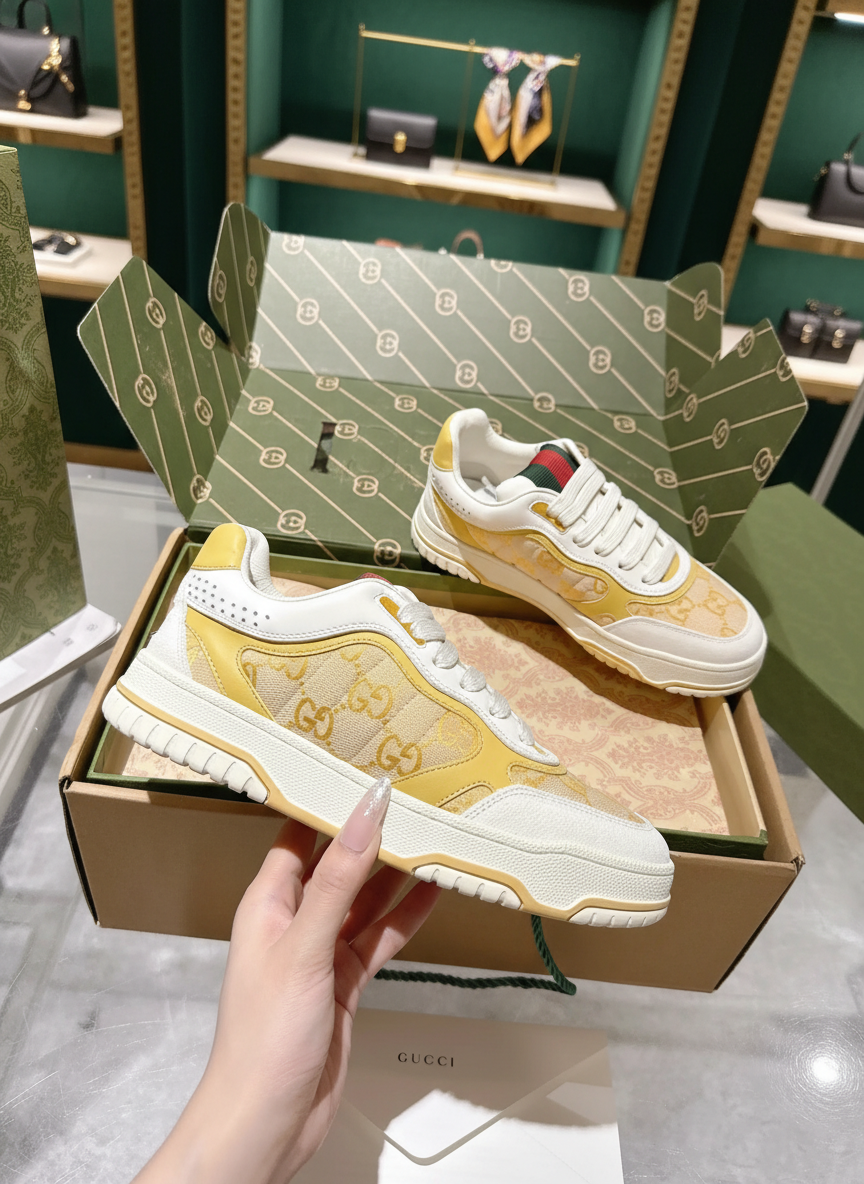 Gucci Yellow GG Monogram Sneakers, stylish designer shoes with premium leather and canvas, trendy casual footwear for men and women, perfect for streetwear and luxury fashion lovers.