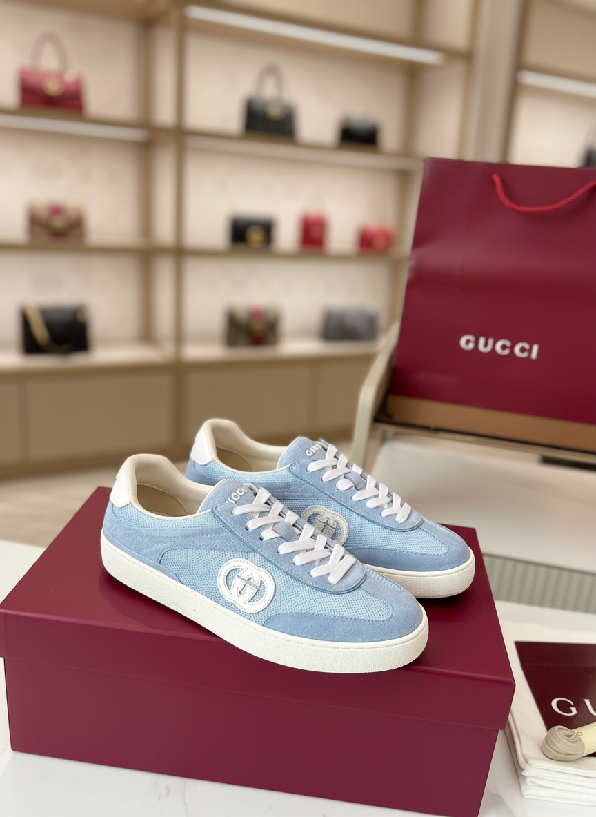 Gucci light blue low-top sneakers with signature GG logo, breathable mesh and suede upper, lace-up design, and comfortable rubber sole for casual stylish wear.