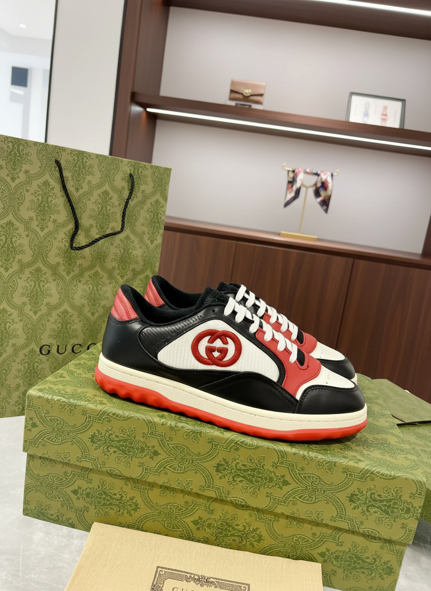 Gucci Men’s Luxury Sneakers, Black Red White Leather Shoes with Iconic GG Logo, Stylish Low-Top Design for Casual and Streetwear Fashion