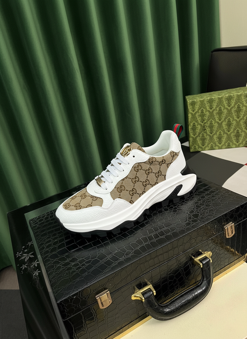 Gucci Men’s Luxury Sneakers, featuring iconic GG monogram canvas, white leather accents, chunky sole design, and stylish comfort for casual or streetwear fashion.
