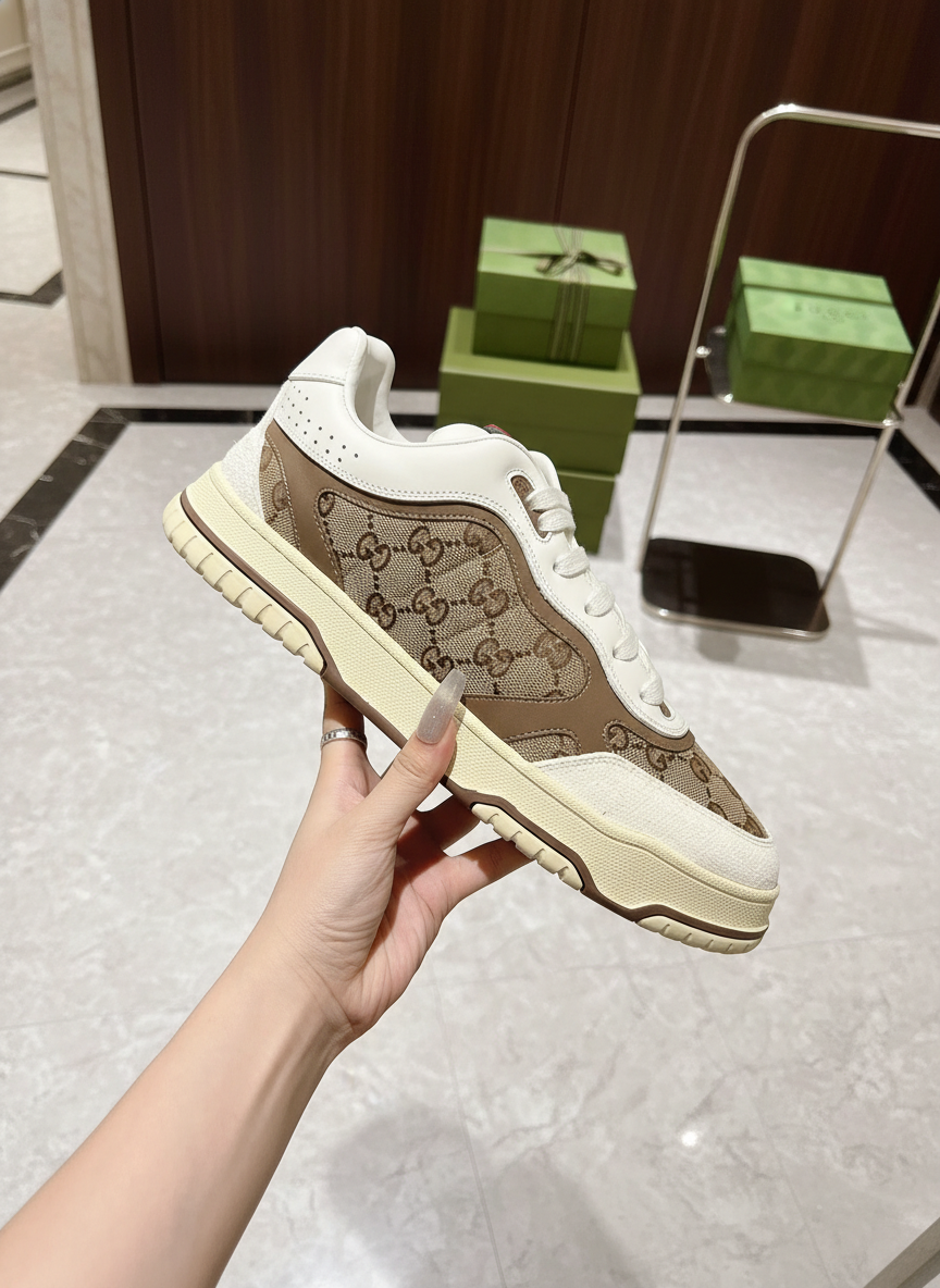Gucci Men’s Beige Brown Monogram Sneakers, premium leather and canvas, stylish casual shoes for walking, travel, and everyday fashion.