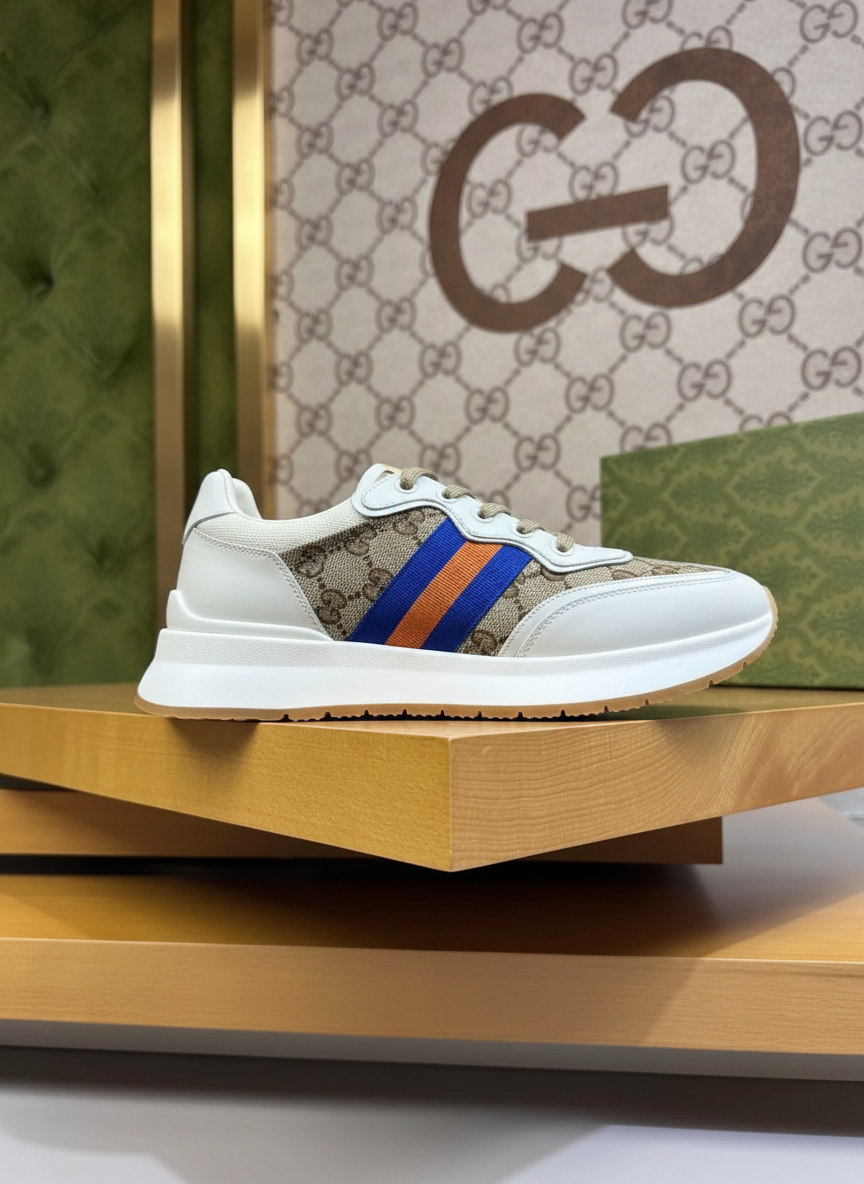 Gucci men’s fashion sneakers with signature monogram canvas, white leather accents, and blue-orange sporty stripes, offering premium comfort and timeless Italian style.