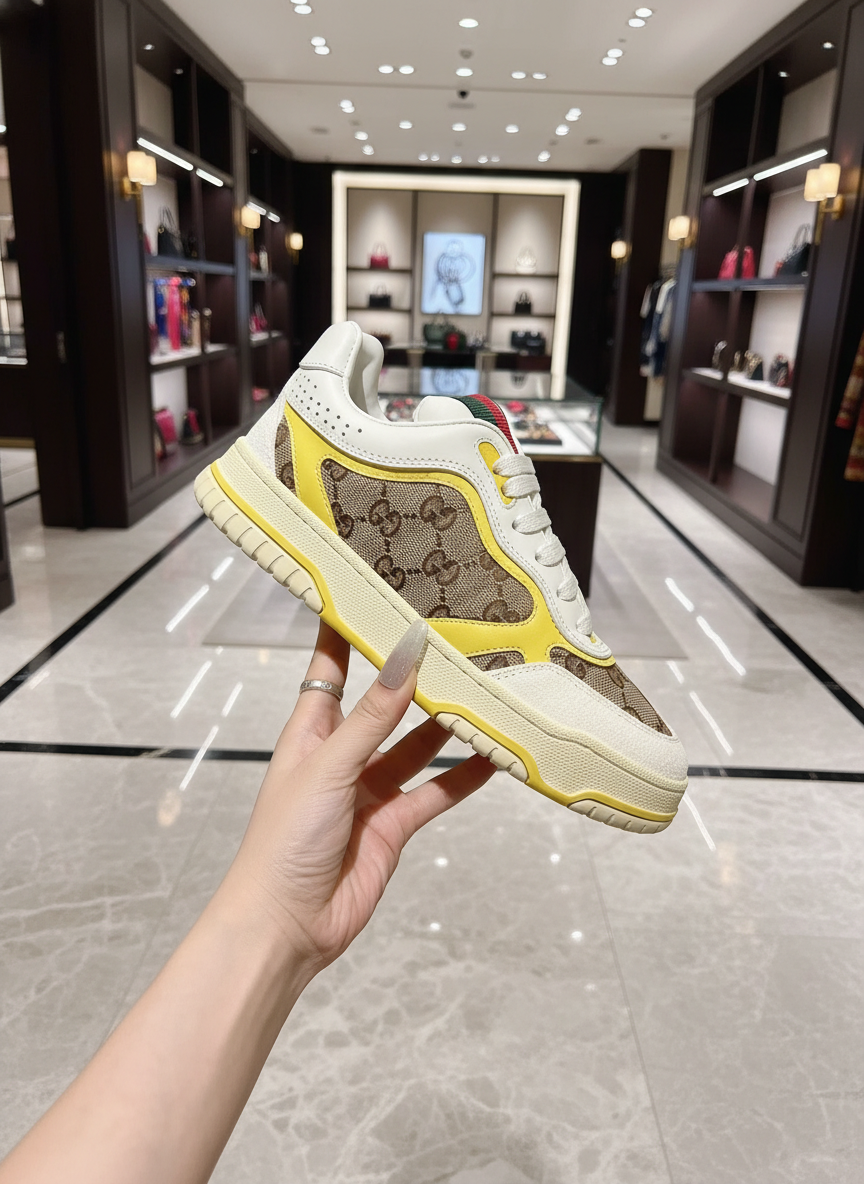 Gucci sneakers featuring signature monogram canvas, yellow leather accents, and retro-inspired design for stylish comfort and luxury streetwear appeal.