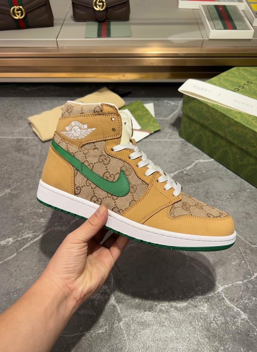 Gucci high-top sneakers with signature monogram canvas, green accent swoosh, premium leather trim, and rubber sole for stylish comfort and streetwear fashion.